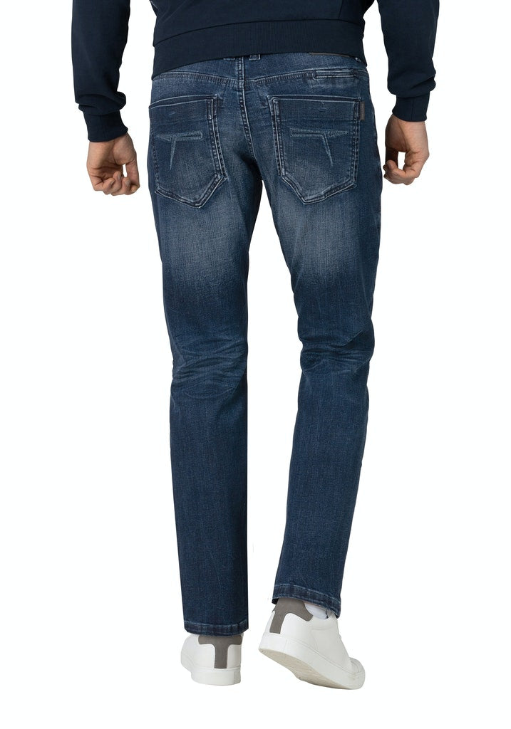 Herren Jeans mit Mustache-Falten von TIMEZONE *Medium Waist Hose *Regular Fit mit Slim Legs *Bund mit Knopf, Reißverschluss und Gürtelschlaufen *5-Pocket-Stil mit kleiner Coin Pocket *Logo-Patch am hinteren Bund *Aus weichem Baumwoll-Stretch mit hellen Waschungen *In Light Royal Wash